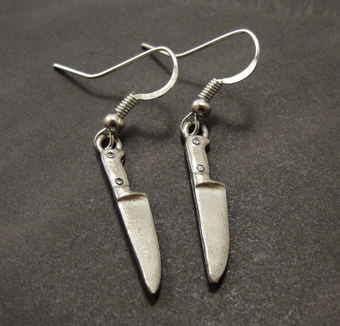 What psycho killer doesn’t love sharp objects? Especially stabby ones! A butcher knife necklace/earring combo, found in treasuredcharms’ shop, is perfect!